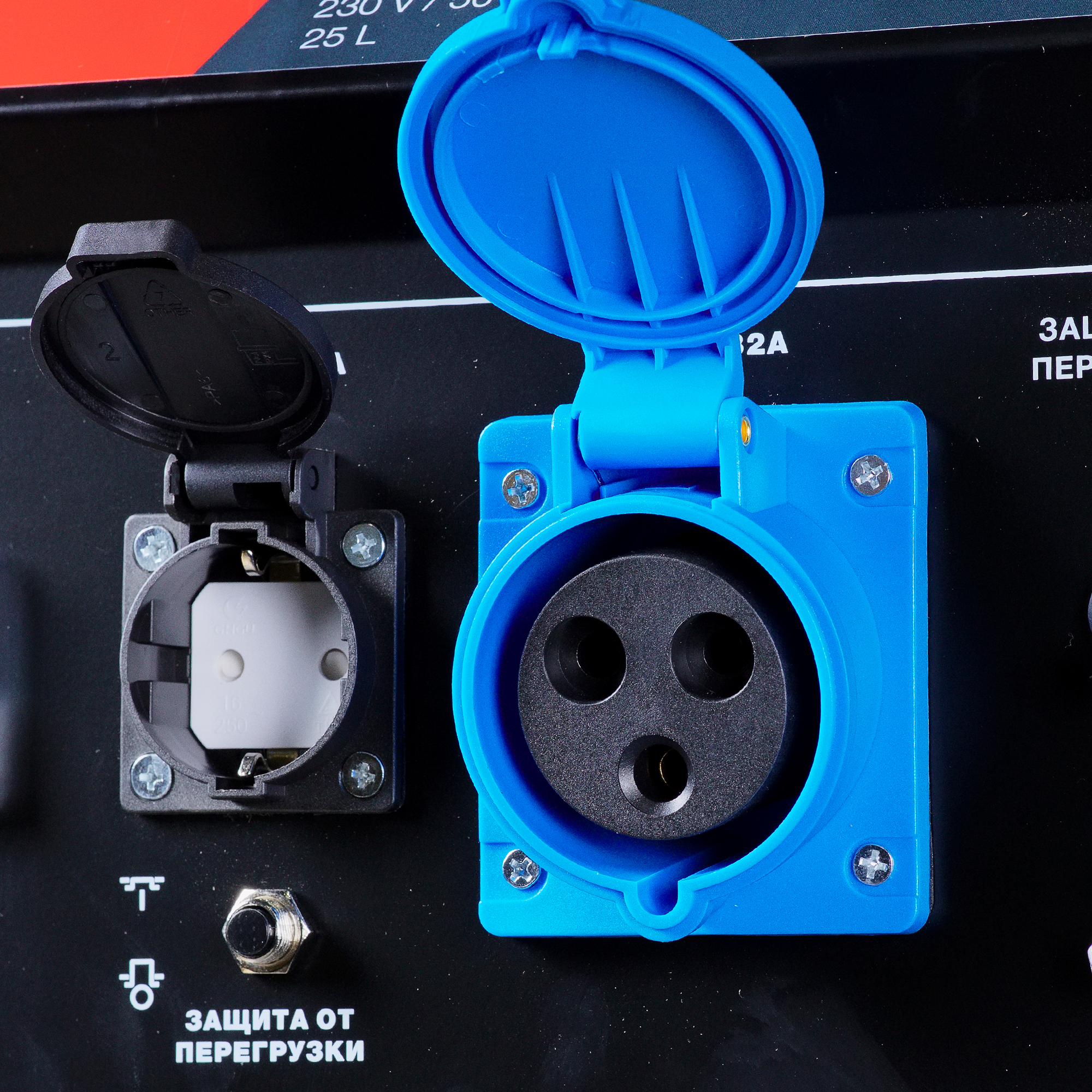 - силовая розетка 230 В/32А для снятия полной мощности при подключении мощных однофазных потребителей;
